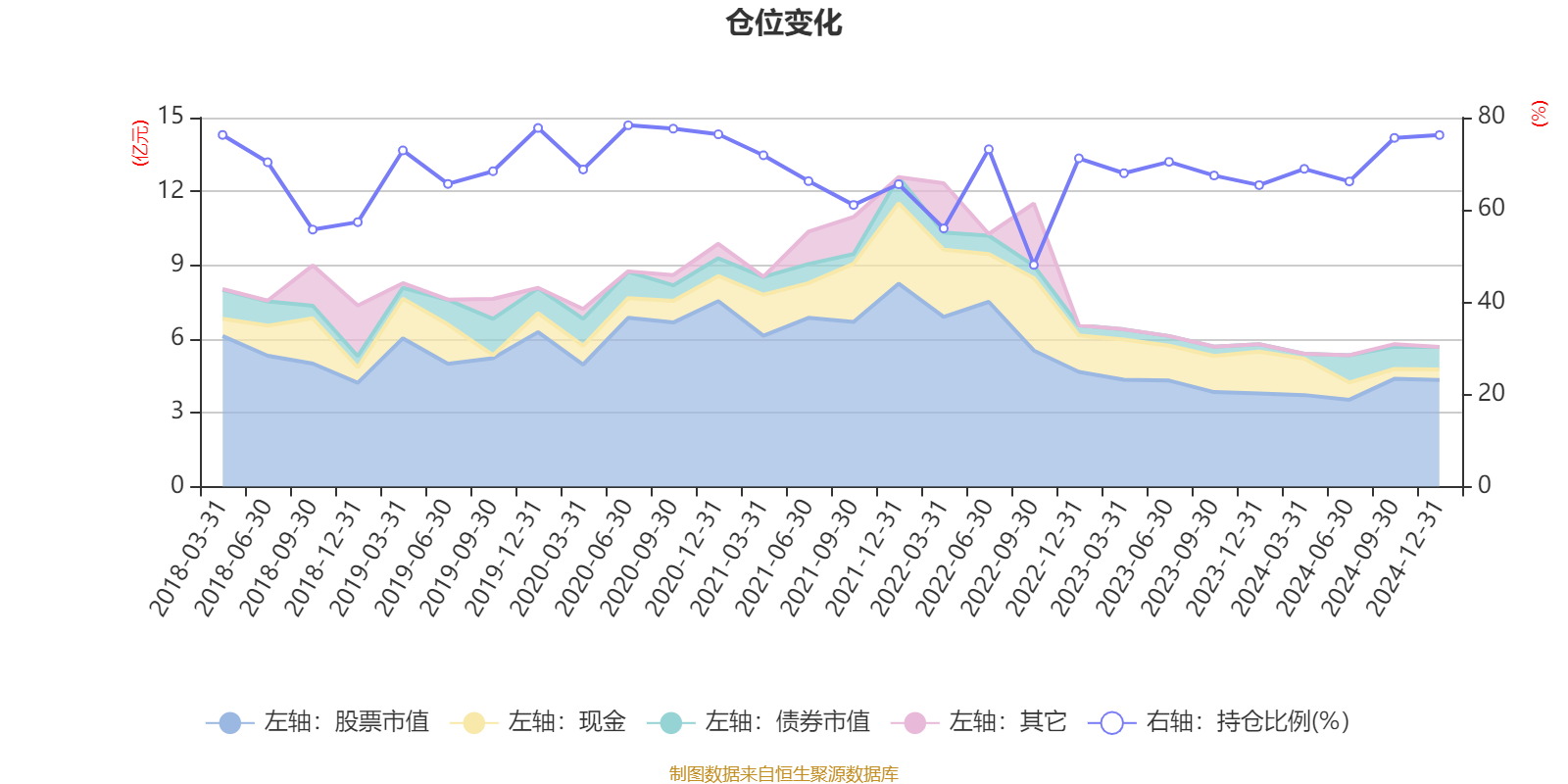 据定期报告数据统计,近三年平均股票仓位为67.19%,同类平均为79.9%。2020年上半年末基金达到78.35%的最高仓位,2022年三季度末最低,为48.05%。